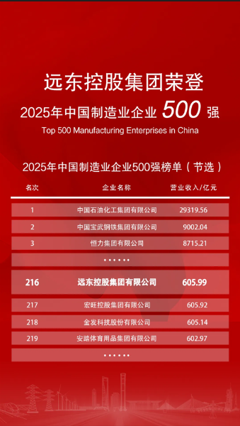 2025年9月20日,2025世界制造业大会在合肥盛大开幕。中国企业联合会、中国企业家协会在大会开幕式上重磅发布“2025中国制造业企业500强”榜单,远东控股集团凭借强劲的综合实力位列榜单第216位,相较去年跃升13位,展现出企业在制造业领域持续进阶的硬核实力。